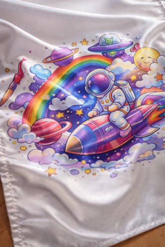 Tecido cetim personalizado com impressão conforme a arte enviada pelo cliente, com largura máxima de 1,40 m.