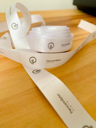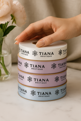 A fita de cetim 10mm com impressão preta equilibra sutileza e presença. É muito usada em caixas de presente, kits, arranjos florais, lembranças e tags