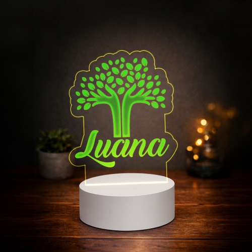 Luminária de mesa com iluminação LED e placa personalizada, que pode receber nomes, frases, logotipos ou ilustrações.